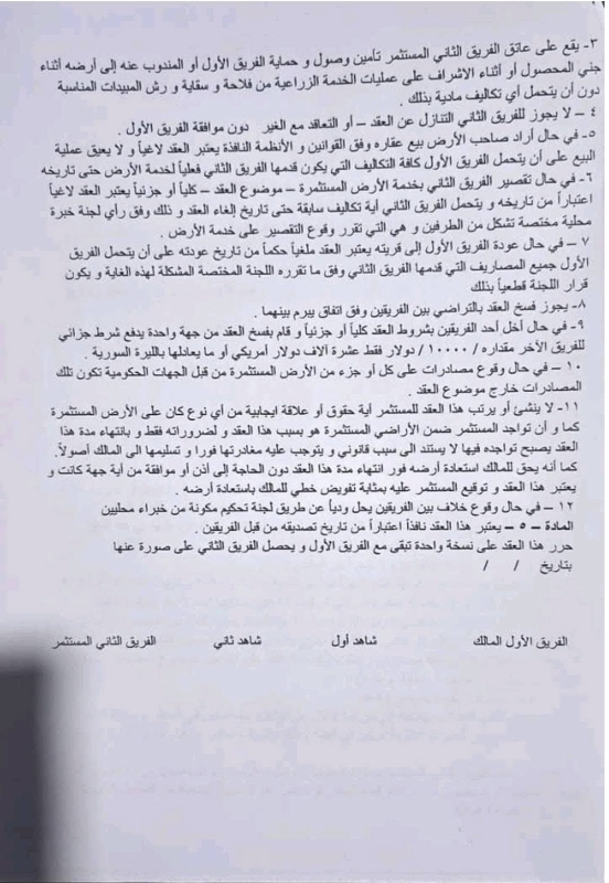 وفي تطور ذي صلة، تم الاطلاع على نموذج من عقود الاستثمار المقدمة، والتي تكشف عن شروط مجحفة بحق أصحاب الأراضي الأصليين، حيث تمنحهم حصة 40% فقط من المحصول، في حين تحصل الشركة المستثمرة على 60% منه.