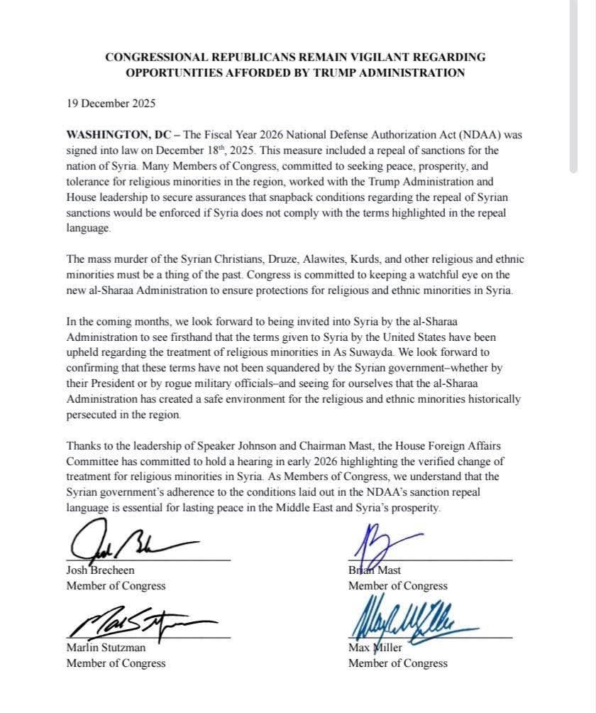 وأوضح الموقّعون أن هذه الخطوة جاءت بعد تنسيق مع إدارة الرئيس الأميركي دونالد ترامب وقيادة مجلس النواب، وتهدف إلى دعم فرص السلام والاستقرار في سوريا، شرط وضع حد نهائي للانتهاكات التي تعرّض لها المسيحيون والدروز والعلويون والأكراد وسائر المكونات الدينية والإثنية خلال السنوات الماضية.