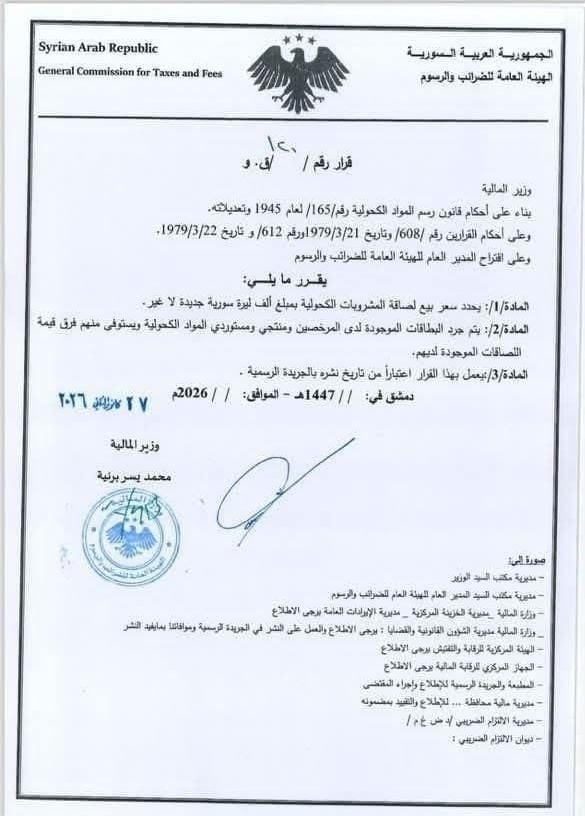 أصدرت وزارة المالية السورية قراراً رسمياً حمل الرقم (120 / ق. و) يوم الثلاثاء 27 كانون الثاني/ يناير 2026، يقضي بتعديل سعر لصاقة المشروبات الكحولية ورفع قيمتها إلى ألف ليرة سورية للوحدة.