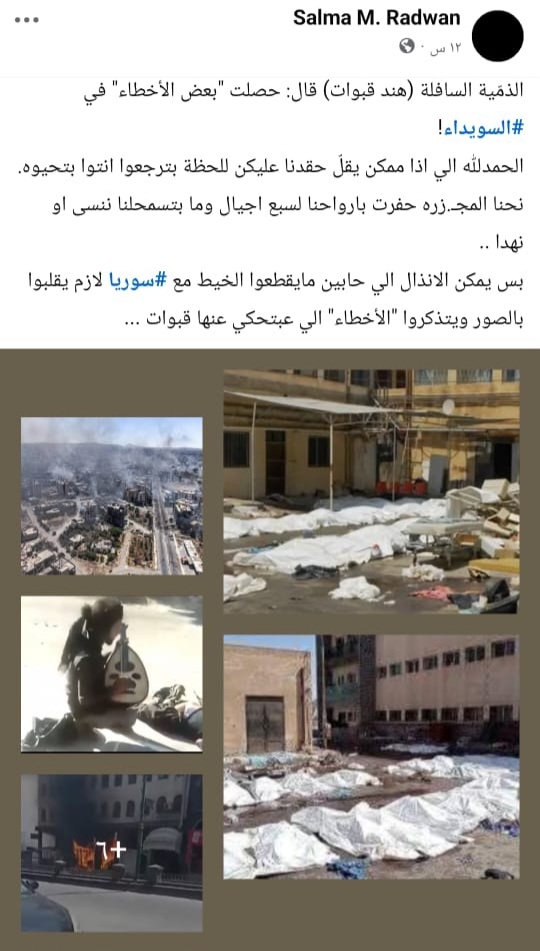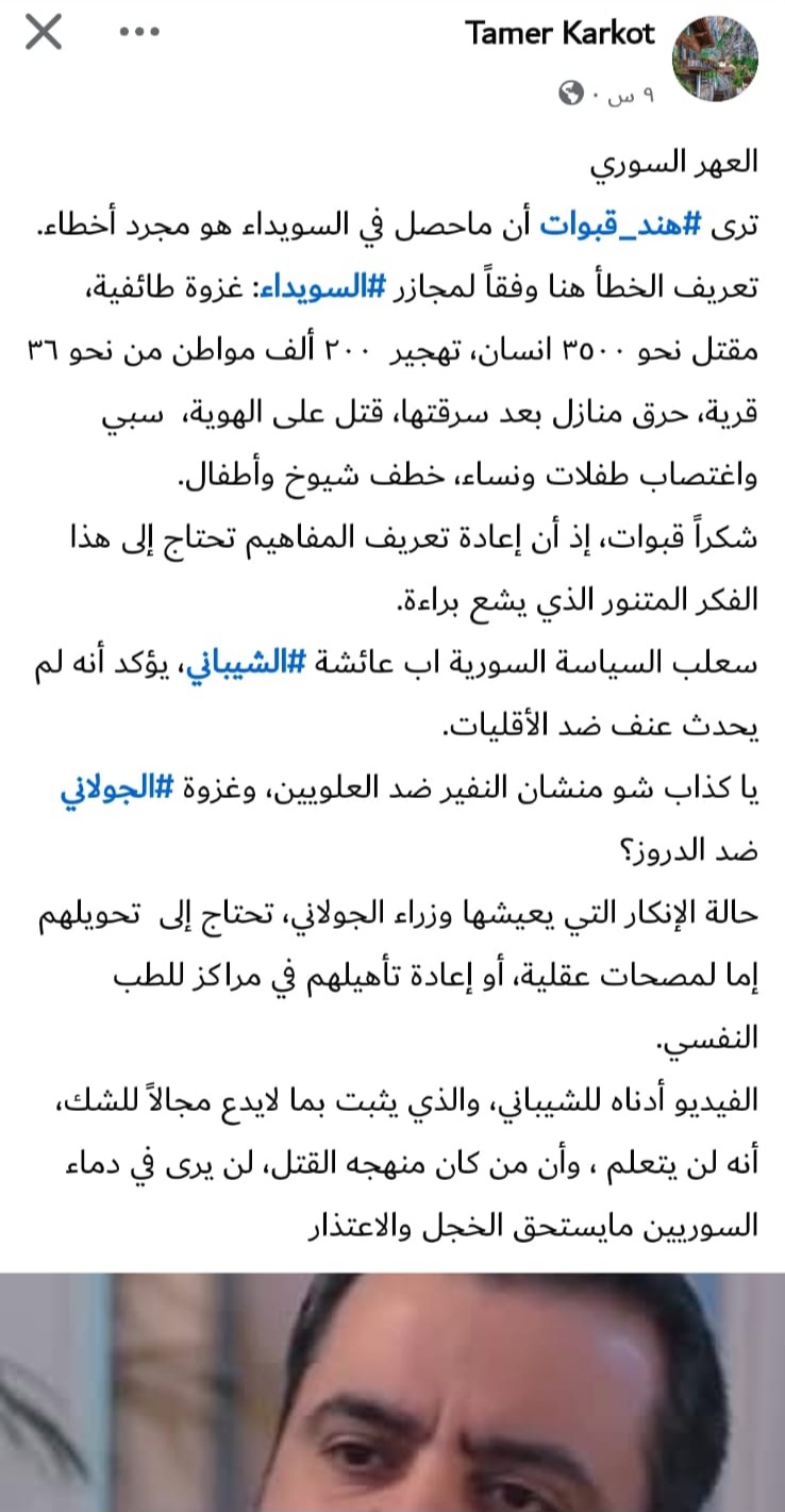 أما الصحفي السوري تامر قرقوط، فقد علق بكلمات لاذعة قائلاً: "تعريف الخطأ هنا وفقاً لمجازر السويداء: غزوة طائفية، مقتل نحو ٣٥٠٠ انسان، تهجير ٢٠٠ ألف مواطن من نحو ٣٦ قرية، حرق منازل بعد سرقتها، قتل على الهوية، سبي واغتصاب طفلات ونساء، خطف شيوخ وأطفال، شكراً قبوات، إذ أن إعادة تعريف المفاهيم تحتاج إلى هذا الفكر المتنور الذي يشع براءة".