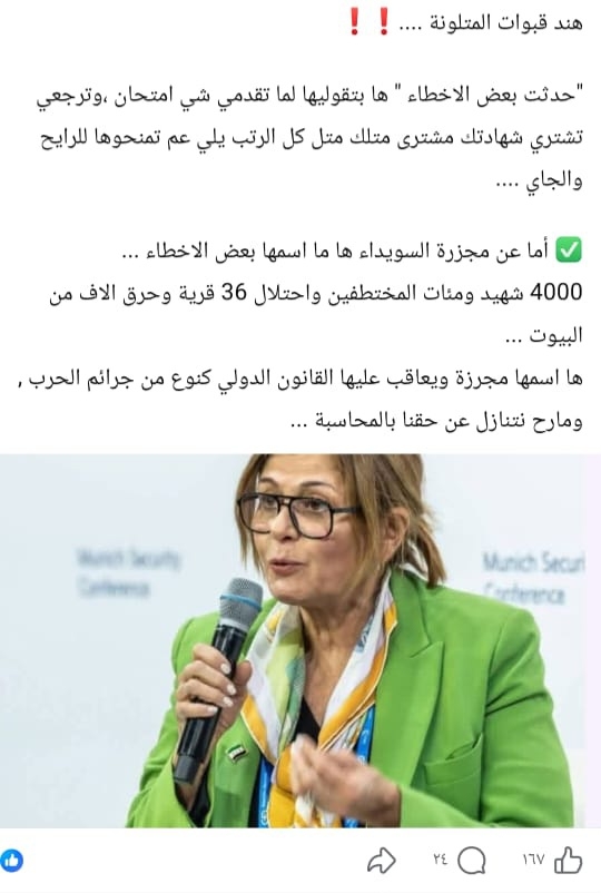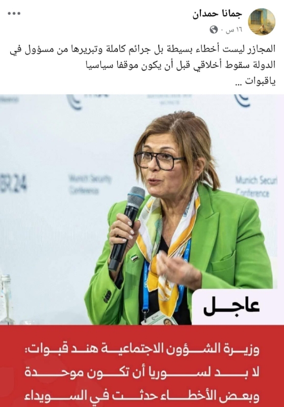 فيما وصفت الإعلامية جمانا حمدان التصريح بـ"السقوط الأخلاقي"، مؤكدة أن "المجازر ليست أخطاء بسيطة بل جرائم كاملة، وتبريرها من مسؤول في الدولة سقوط أخلاقي قبل أن يكون موقفا سياسيا".