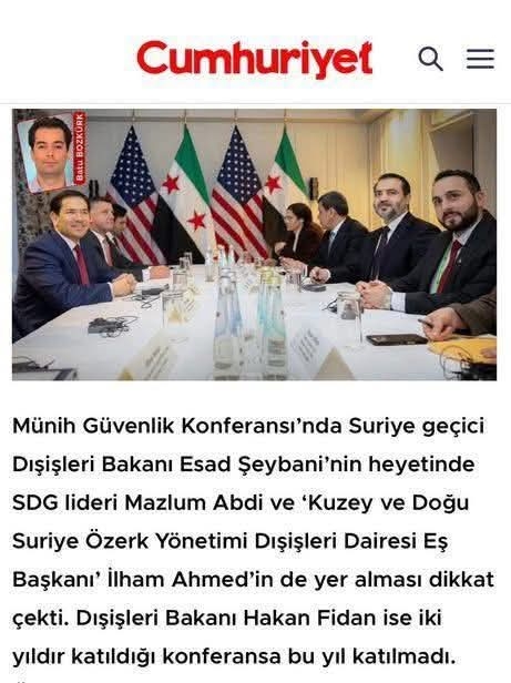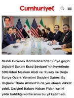 ونقلت جمهوريت عن مصادر في وزارة الخارجية التركية حديثها عن هذه التطورات، كما أوردت تقييم المحلل السياسي أيدين سيزر، الذي قال إن ظهور مظلوم عبدي ضمن وفد رسمي في ميونيخ يؤكد أن الأكراد لم يُهزموا في سوريا، معتبرًا أن ما جرى يمثل اعترافًا دوليًا بالواقع الكردي واندماجًا مميزًا في الحكومة المركزية، بشرط عدم تقسيم سوريا.
