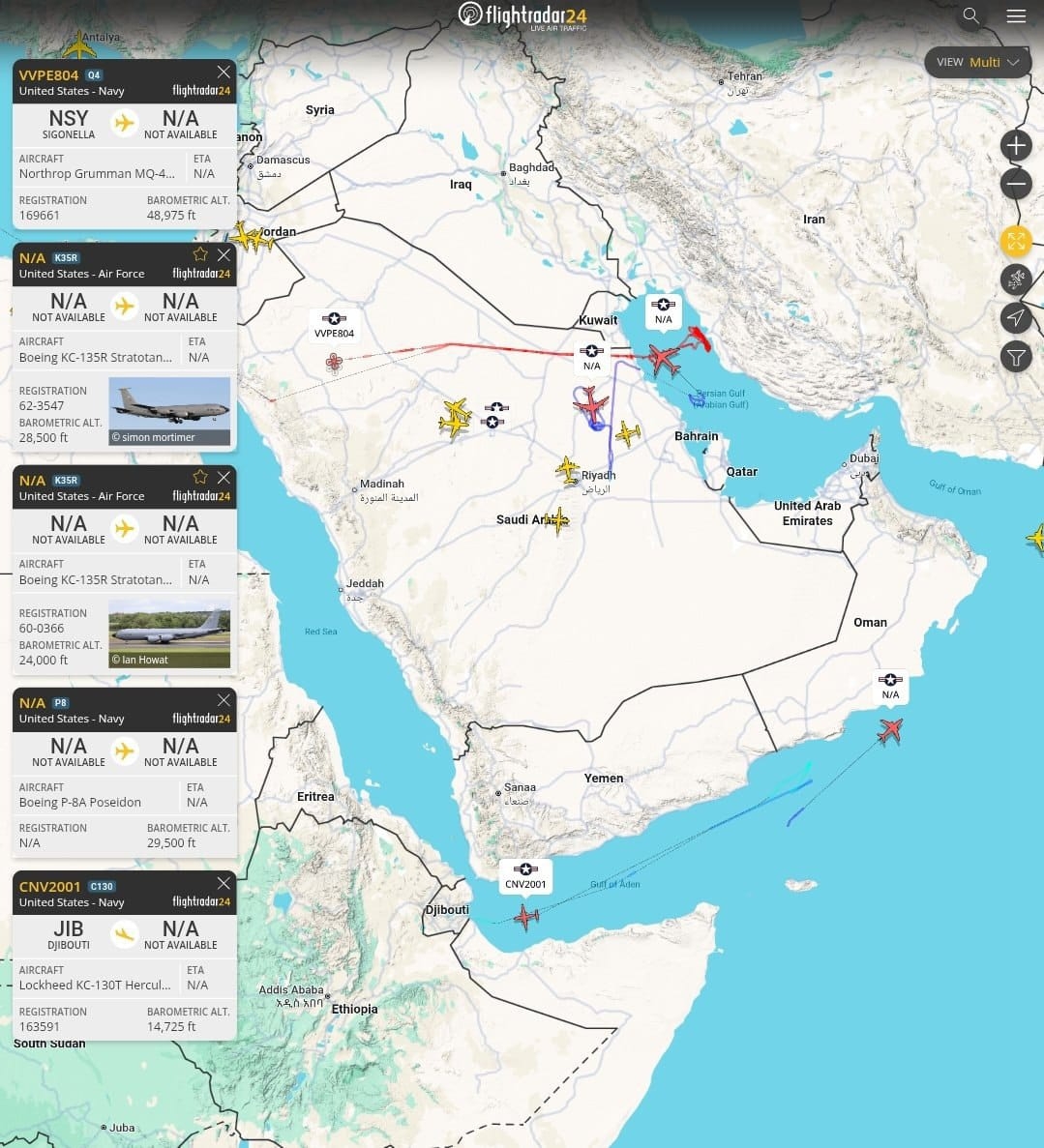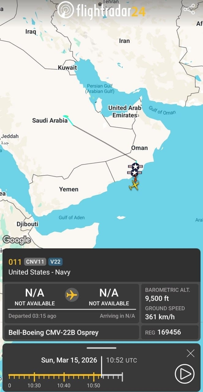فقد رصدت المنصات المتخصصة في تتبع الرحلات إقلاع طائرة نقل عسكرية من طراز "سي إم في-22 بي أوسبري" (CMV-22B Osprey) تابعة للبحرية الأمريكية، وتحمل الرقم التسلسلي 169456، من قاعدة الأمير سلطان الجوية في المملكة العربية السعودية. وتوجهت الطائرة صوب المنطقة البحرية الواقعة قبالة سواحل مدينة صلالة في سلطنة عُمان.