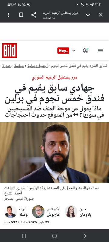سلّطت صحيفة بيلد الألمانية الضوء على زيارة الرئيس السوري المؤقت أحمد الشرع إلى برلين، ووصفتها بأنها واحدة من أكثر الزيارات حساسية وإثارة للجدل على الساحة الأوروبية هذا العام، في ظل ماضيه المرتبط بقيادة فصائل جهادية وانتقادات متزايدة لسجله الحقوقي.