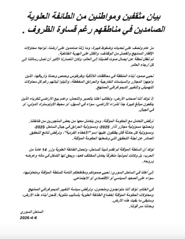 وأعلن البيان تمسك الطائفة العلوية بوحدتها وتلاحمها، رافضاً سياسة التغيير الديموغرافي الممنهج ومحاولات الحكومة المؤقتة إخضاعهم بأساليب ملتوية، ومؤكداً أنهم أبناء هذه الأرض وسيبقون فيها ما بقيت.