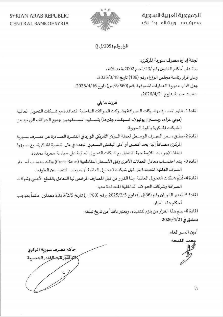 أكد المحلل الاقتصادي محمد علبي، أن القرارات الأخيرة الصادرة عن مصرف سوريا المركزي، والتي من المقرر أن تدخل حيز التنفيذ مع مطلع أيار 2026، ستؤدي إلى خسارة المواطن السوري نحو 16 دولاراً من كل 100 دولار يتم تحويلها إلى سوريا، وذلك نتيجة الفارق بين سعر الصرف الرسمي وسعر السوق، دون احتساب رسوم التحويل نفسها التي تصل في كثير من الحالات إلى نحو 4% من قيمة الحوالة.